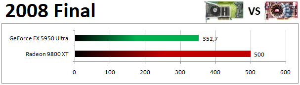 Ideje elbúcsúzni a legrégebbi DX9-es kártyagenerációtól ebben az évben, hiszen mindössze 7 játékot voltak képesek futtatni a 20-ból, és az esetek többségében ezekben sem tudtak játszható sebességet nyújtani. Természetesen a 9800 XT idén is a földbe döngölte az FX-et, de az összetettbeli különbség némileg csökkent közöttük az előző évhez képes, hiszen mindketten szenvedtek csak az idei játékokkal (és ami azt illeti, valószínűleg az AGP-s tesztrendszerem sem volt már megfelelő ennek az évnek a kihívásaihoz).