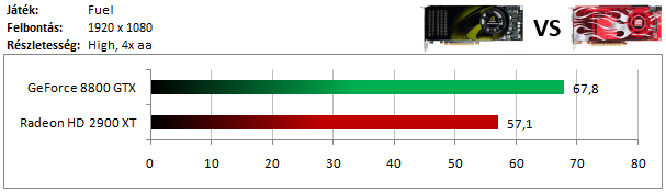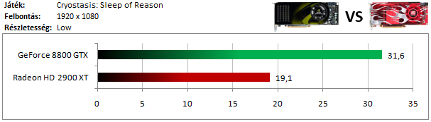 Hasonló a helyzet a 8800 GTX - HD 2900 XT párossal is. A játék DX10-es GPU-t igényel, ezért a régebbi kártyákon egyáltalán el sem indult, de az itteni eredményt látva ennek amúgy sem lett volna sok értelme.