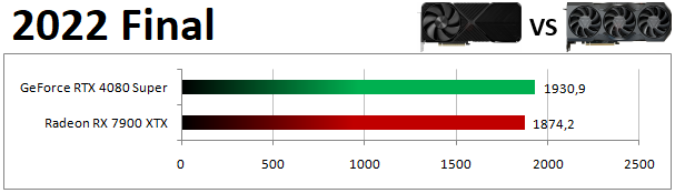 Szinte meglepő lehet, de a 20-ból 7 db játékot még ez az elavult páros is el tudott indítani az idei felhozatalól, igaz, ezek közül 1 db a GeForce-on sem futott. A maradék 6 tesztet viszont megnyerte, míg a Radeon csak alig több, mint feleannyi pontot volt képes szerezni, vagyis veresége idén is letaglózó. Ennek ellenére hiba lenne azt feltételezni, hogy a GTX 580-at érdemes volt még használni 2022-ben, hiszen csak a legalacsonyabb minőségi szinten, és többnyire 720p felbontásban reménykedhettünk vele játszható sebességben.