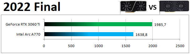 Az Intel kártyája egyértelmű vereséget szenvedett a 3060 Ti-tól, hiszen néhány meglepetésszerű győzelmet leszámítva szinte mindig mögötte végzett, olykor hatalmas lemaradással. Viszont új belépőről lévén szó, nem vethetjük az Intel szemére, hogy nem minden körülmények között tökéletesen versenyképes, és alapvetően használható sebességet produkált az összes játékban, ráadásul inkompatibilitásokkal, fagyásokkal, vagy képhibákkal sem szembesültem, ami miatt mindenképp dicséretet érdemel, még akkor is, ha az összteljesítmény tekintetében még van hova fejlődnie a vezető processzorgyártó GPU-inak.