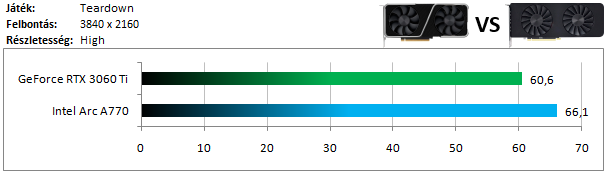 Az Intel kártyájának nagyon nem fekszik ez a játék, és csak alig több, mint fele akkora sebességre képes, mint a 3060 Ti.
