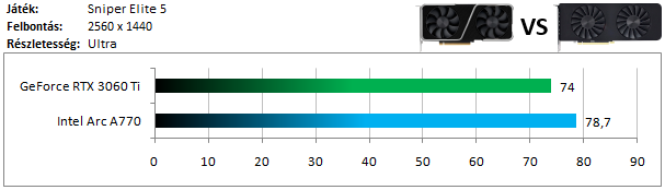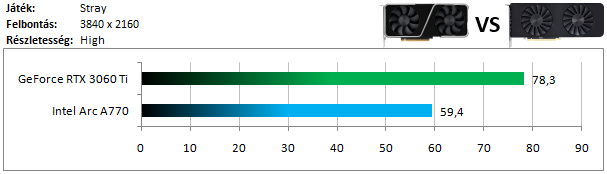 Az Arc A770-nek nagyon tetszik ez a játék, így azon ritka esetek egyikét látjuk, amikor maga mögé tudja utasítani a 3060 Ti-t.
