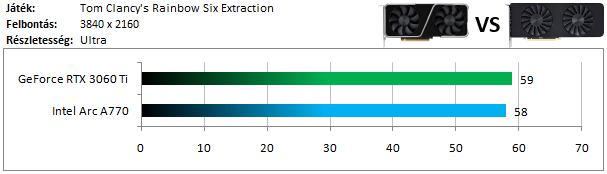 Az A770 és a 3060 Ti szinte pontosan ugyanolyan teljesítményre képesek, ami az Intel versenyzője számára jelent dicséretet.