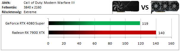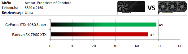 A játék gépigényét jól szemlélteti, hogy a legerősebb kártyák sem voltak képesek maximális részletesség és Raytracing mellett jó sebességet produkálni, még Full HD felbontásban sem (az upscaler-ek természetesen ezúttal is ki voltak kapcsolva). Mindazonáltal a 4080 Super több, mint dupla akkora sebességet ért el, mint az RX 7900 XTX, így hatalmas győzelmet aratott ebben a játékban.