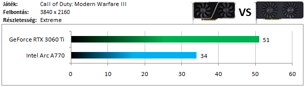Kiváló eredményt ér el az Arc A770, hiszen legyőzi a 3060 Ti-t, még ha előnye nem is túl nagy mértékű.