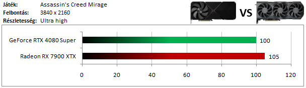 NVIDIA RTK kártyával van path tracing a játékban, de csak a menüben jelenik meg, a játékteljesítményre nincs hatása. Így történhetett meg, hogy az RX 7900 XTX jócskán elverte a 4080 Super-t. Természetesen felbontás-felskálázást ezúttal sem használtam.