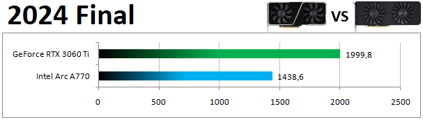Az Intel kártyája idén nem szerepelt túl jól, és jócskán megnőtt a lemaradása az előző évhez képest az RTX 3060 Ti-hoz viszonyítva. Az Intel számos rendszerszintű problémával küszködött már ebben az időszakban, és a mellékágnak tekinthető GPU-részleg talán kevesebb erőforrást kapott a kelleténél, így nem sikerült a drivereket megfelelően optimalizálni minden játékhoz, de az is lehet, hogy egyszerűen csak kifulladóban van ez az architektúra, és nem lesz túl jó az időtállósága a jövőre nézve. Bárhogy is alakul, mindenképp érdekes csatát vív egymással ez a két szereplő, és üde színfoltjai a cikknek.