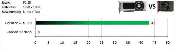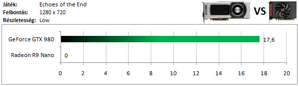 Egy ennyire magas gépigényű játék esetén nem meglepő, hogy a Fury-val nem indul el, de a GTX 980 sem képes játszható sebességet elérni a legalacsonyabb minőségi szinten sem.