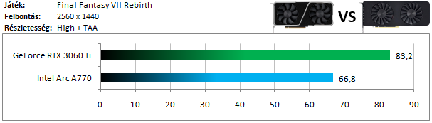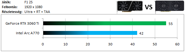 Ezúttal az Intel kártyája is csak átlagos mértékű lemaradásban van a 3060 Ti-hoz képest.