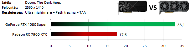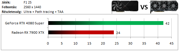 A játék Path tracing alapú renderelést is támogat, ami a következő lépcső lesz a Raytracing után. Látható, hogy kizárólag NVIDIA kártyával érdemes próbálkozni a technológiával, de a 4080 Super is csak WQHD felbontásban tudott éppen csak játszható sebességet szolgáltatni.