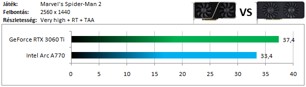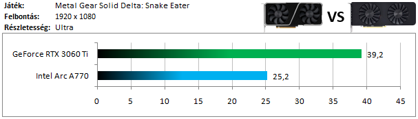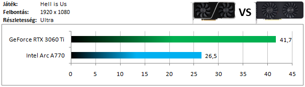 Az Intel kártyája nagyon gyengén szerepel ebben a játékban, hiszen alig több, mint fele akkora sebességre képes csak, mint a 3060 Ti.