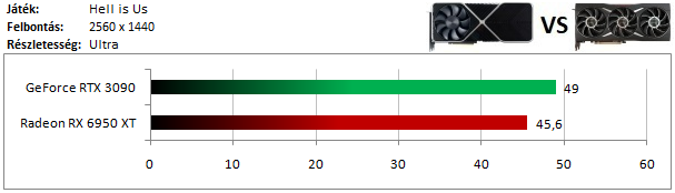 Ezúttal a 6950 XT is megveri az RTX 3090-est, de ezekkel a kártyákkal a felbontást már WQHD-ra kellett csökkenteni.