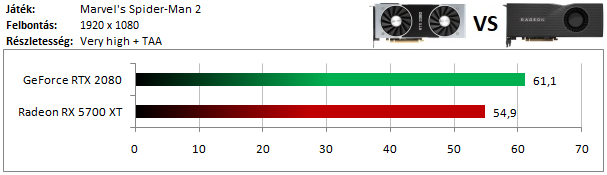 Jól szerepelt viszont az 5700 XT, hiszen megelőzte a 2080-ast, ami mindig felveti annak a gyanúját, hogy a játék alkalmaz némi sugárkövetést annak ellenére is, hogy a beállítások között ezt nem teszi kikapcsolhatóvá.
