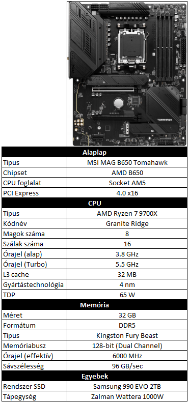 A cikk bővített kiadásának elkészítésekor egy új tesztrendszert is bevetettem, hiszen a legújabb GPU-generációhoz, valamint a 2024-es és 2025-ös játékokhoz már gyenge lett volna az eredeti tesztgép. Ráadásul az Intel Arc A770 kártyának szüksége van a "Resizable BAR" nevű funkcióra a megfelelő működéshez, amit a régi platform még nem támogatott, így mindenképp szükség volt a cserére. Emiatt az új tesztgépet a 2022-es és a 2023-as évben is bevetettem a két újonnan érkezett GPU-páros esetén. Választásom ezúttal az AMD legutolsó Ryzen generációjára esett, hiszen játékos célra jobban ajánlják őket, mint az Intel aktuális megoldásait.