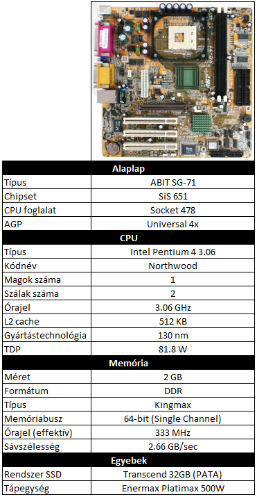 Az AGP-s tesztrendszer kiválasztásakor az elsődleges szempont az Universal AGP támogatás volt, vagyis az, hogy a legrégebbi és a legújabb AGP-s kártyák is működjenek benne. Az egyik legerősebb platform, ami alá még létezett ilyen foglalatot támogató alaplap, a negyedik generációs Pentium processzorokat fogadó Socket 478 volt. Ugyan az Intel ekkoriban már nem támogatta hivatalosan a régi, 3.3V-os AGP 2x szabványt, de egyes chipset gyártók, mint például a SiS, készítettek támogatást az elavult videokártyákhoz is. Az ABIT SG-71 típusú alaplap talán a legelterjedtebb ebből a kategóriából. Mellé a legerősebb processzort társítottam, amit még kezelni képes: a 3.06 GHz-es Northwood magos P4-et, mely papíron Hyperthreading-képes is, de az alaplap ezt nem támogatja. Szintén nincs Dual Channel DDR támogatás, és a memória órajele is maximum 333 MHz lehet. Ezekkel a limitációkkal együtt kellett élni a régi AGP-s kártyák támogatásáért cserébe. A gép tökéletesen üzemelt Windows 98, majd 2001-től Windows XP alatt is.