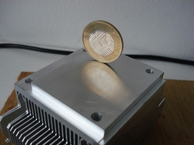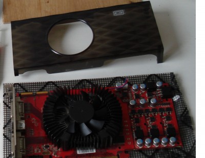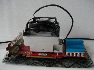 Először is a gpu/procihűtőt(Arctic Cooling Alpine 64) kellett közös nevezőre hozni, és figyelni hogy be is férjen a házba. Aggódtam hogy oldom meg a venti tápellátását, de a vga-ról leszedve a gyári ventihez való csatlakozót, egy az egyben rá lehet dugni az arctic cooling hűtőt, annak ellenére hogy a procihűtő 3tűs, a kártya meg csak 2, így kimarad a fordulatszám szabályzó ág, de szerencsére pont olyan fordulaton pörög, hogy hűs is, meg halk is. Bordázat már nem volt ennyire készséges, gondosan kifúrtam a lyukakat, aztán egy két lamellát el kellett hajlítani, különben a csavarok nem férnek el. Elég érdes volt a hőátadó felület, ráfért egy polírozás. Nagyon sima felületű satupadra tettem egy finom csiszolópapírt, aztán a hűtőbordát mozgattam rajta, így elkerülhetők a mélyedések. Azt mindenki döntse el maga, hogy jó lett-e: