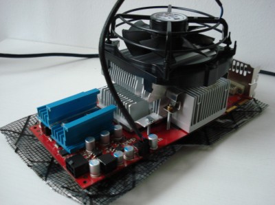 Jöhetett a ramhűtés, amihez félbevágtam egy régi procihűtőt. Az egyiket igen egyszerűen fel tudtam tenni, csak megfelelő formára kellett hajlítgatni a régi am2-es venti lefogatóját, azt ráaggatni. Azon lepődtem meg, hogy a szerszámos-láda mélyén talált hosszú csavarok passzoltak a gyári menetbe. A másik bordával küszködtem egy darabig, aztán rájöttem, hogy lehajtok a 2 végén egy-egy lamellát, kifúrom azt anyacsavarral jó is lesz.