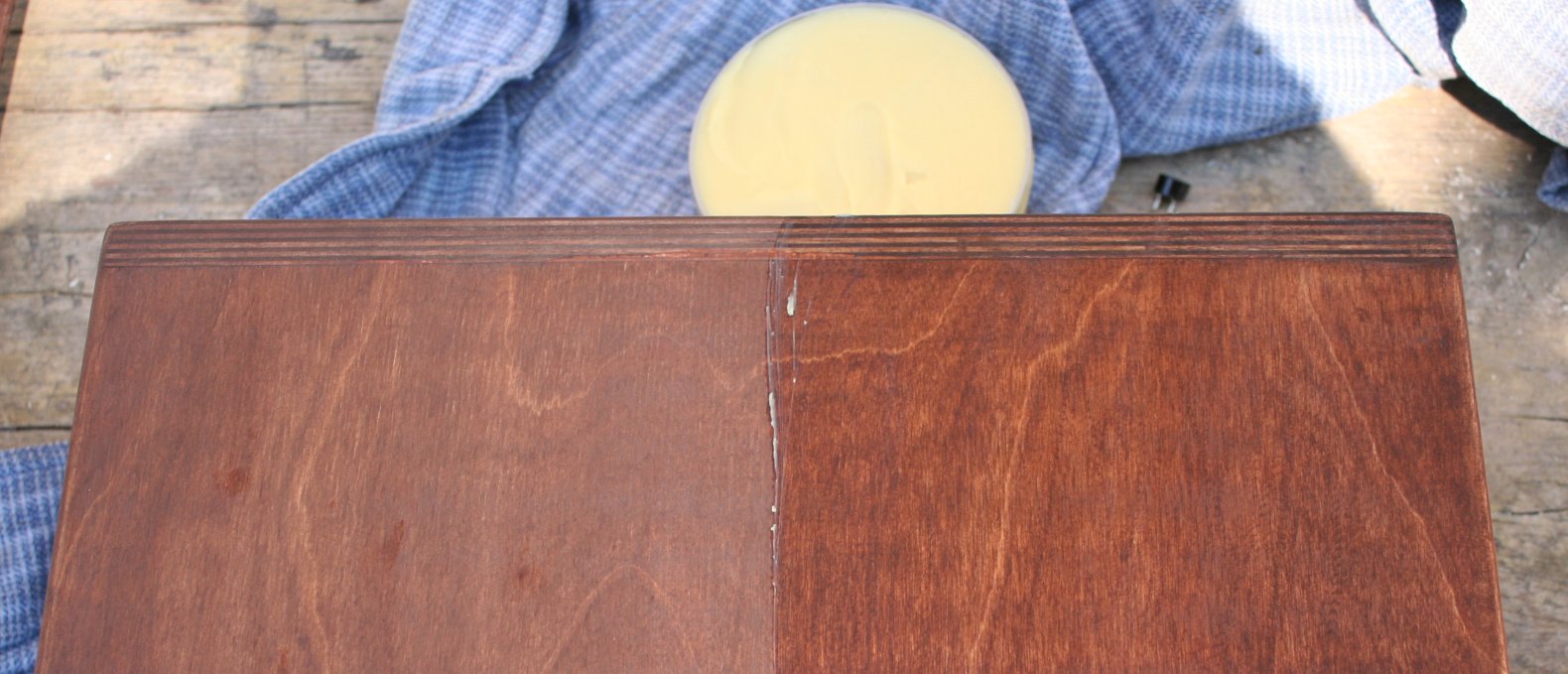 Ismét várakozás következett, amíg a viaszt beitta a fa. Az ing egyik ujjával addig dörgöltem szálirányba, amíg szép selymes fényt nem sikerült elérnem. Sajnos nem merem azt mondani, hogy tökéletes lett az eredmény. Az eltolt lakkozás és a sok csiszolás miatt nem lett az. Inkább azt mondom, hogy abbahagytam, mintsem befejeztem a dobozt, amiben ekkorra az elrontásokkal együtt benne volt 18 óra munka részletekben.