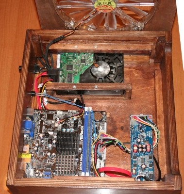 Az utolsó lépés az alkatrészek beépítése volt. A táp és a bekapcsoló gomb is a hátlapra, a 20-as ventilátor pedig az alsó lapra került. A merevlemezt szilárdan felcsavaroztam. Az alaplap és a paneltáp alá távtartók kerültek, amikbe még régebben besüllyesztettem a normál házakban is használt ellendarabokat. Mivel 15mm-el megemeltem az alaplapot az összes kábel elfér alatta. A paneltáp és alaplap közötti kábelt, igaz csak sima zsinórral, szépen végigvarrtam. Utolsó simításként felragasztottam a szilikongumi lábakat.