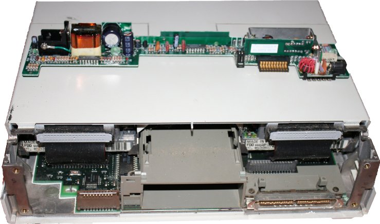 Felnyitott állapotban a kis résen keresztül bármi bekerülhetett a gépbe, ezért jónak láttam kicsit kipucolni használat előtt. Első lépésként a hátul található fedelet távolítottam el és kiemeltem az energiaellátásért felelős részeket. Az akku 87 szeptemberében készült. Meglepő módon nem teljesen halott, terheléstől függően 5-10 percig viszi a gépet. A kép jobb oldalán látható a bővítő port, ami egy multiplexelt ISA busz. Ide lehet csatlakoztatni az opcionális hőnyomtatót ($295) vagy bővítő portokat (CGA $350, soros/párhuzamos $195). A nyomtató nagyjából 17 centiméterrel és 3.5 kilóval dobja meg a gépet, ehhez kell az említett masszív hordfül.