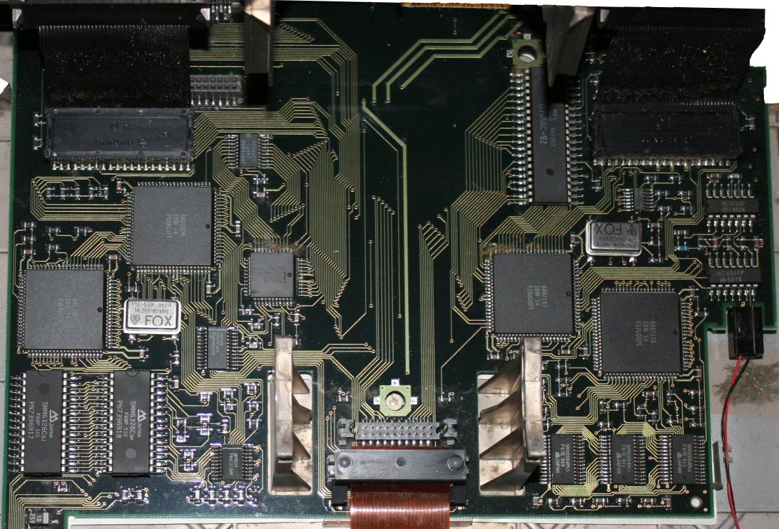 A meghajtót tartó csavaroknál lettem biztos benne, hogy valaki már kinyitotta a gépet. Sikerült olyan erővel meghúznia több csavart, hogy szimplán letörtek a műanyag fülek. A lemezek kihúzása és a monitor kábelének eltávolítása után hátra tudtam buktatni az alumínium fedlapot. Levenni nem akartam, mert a floppyk kábelei rágyógyultak az alaplapra. A gép 80C88-as erőforrása szerényen bújik meg a sokkal nagyobb IC-k között. (Bal oldali fém tartófül fölötti IC) Meglepett a kis méretű az alaplap, a hasonló korú desktopok inkább tepsi méretű lapokkal rendelkeztek.