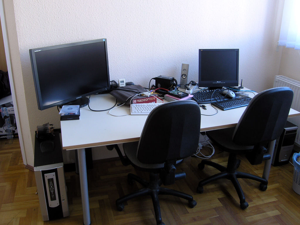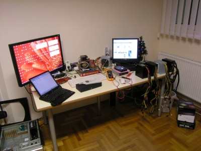 Ami nem lehet elég nagy, hisz ha meló van, akkor pillanatok alatt elfogy a hely, erre nincs is jobb bizonyíték, mint az alábbi kép, ahol éppen rudi és a négy 400 wattos táp meg fél tucat VGA birtokolja a helyet.