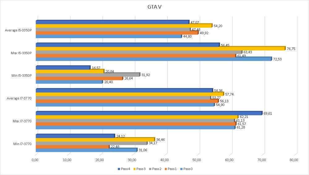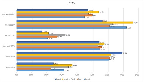 Teszteltem a GTA V beépített benchmarkjával is a processzorok teljesítményét. Az alap GTA V-re rátelepítettem a Redux 4 GB-os addonját, ami realisztikusabb grafikát és számos beállítási lehetőséget nyújt a különböző shader opciók alkalmazása mellett. Én a redux ultra V2-est használtam és így teszteltem i5 és i7 esetében. Az alábbi táblázatban az 5 teszt eredményei láthatóak: