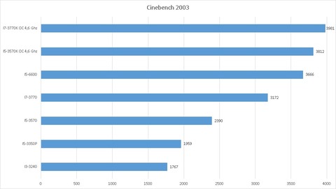 Gyönyörűen látszik, a CPU órajelével növekedve nő a pontszám. Az összehasonlítás kedvéért beleraktam az i5-6600-as Skylake processzort is. Az eredeti i3-3240-eshez képest számolási teljesítményben az i7 114%-os növekedést ért el. Ugyanakkor látható, hogy a 4,6 GHz-cel járatott i5-3570K még így is győzedelmeskedik az i7 felett.