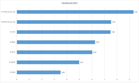 Az újabb verziónak köszönhetően a többszálas utasításokra optimalizált programnál már az i7 a maga 4+4 szálával átveszi a vezetést, de szorosan ott van mögötte a túlhajtott i5-3570K. Itt is 2x teljesítménynövekedés érhető el az i7-es javára (2x annyi mag és HT). Érdemes megfigyelni, hogy a Skylake gyakorlatilag alacsonyabb órajelről indul és jelen esetben ugyanott áll meg a maximum órajele, mint a szimulált i5-3570-nek mégis 6-7% előnye van az új architektúrának. A tuningolt i7-3770K így is 26%-al többet tud mint az alapon járatott i7-es.