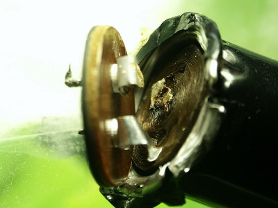A szétszedett kondenzátorban jól látható a leszakadt láb és a hengert