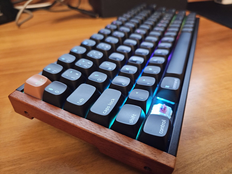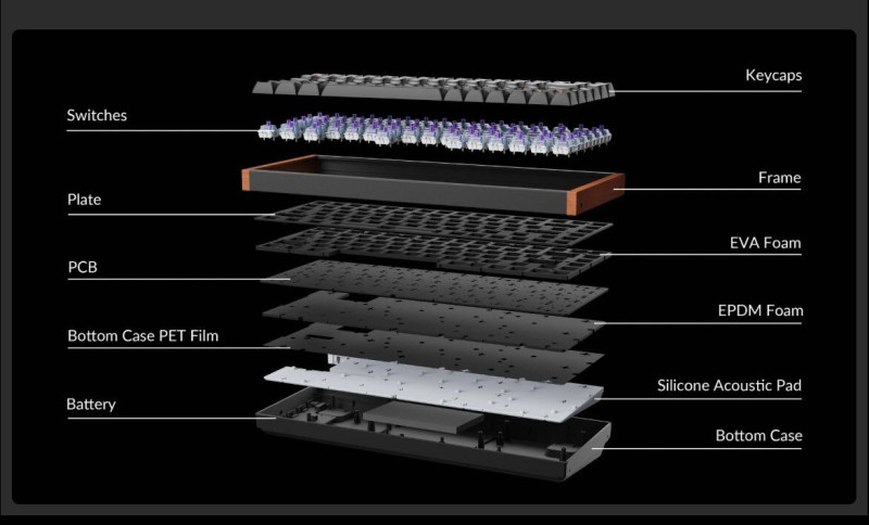 A keret és a keycapek: A keretünk alumínium, műanyag a hátlap és a keycapek pedig OSA double-shot ABS, átvilágított.