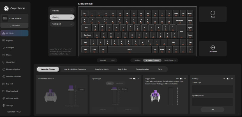Kapcsolók: Ahogy említettem Gateron márkájú Nebula Linear, tehát lineáris kapcsolókat kapunk. A Keychron K2 HE előre kent Gateron kétsínes mágneses kapcsolókkal rendelkezik, amelyek rendkívül stabil és rendkívül érzékeny gépelési élményt nyújtanak, iparágvezető, villámgyors válaszidővel és a billentyűzet érzésének és reakciójának pontos vezérlésével. A kapcsolóknak állítható működtetési pontjuk van. Az egyes billentyűket precízen testre tudjuk szabni, 0,2 és 3,8 mm közötti működtetési pontokat és 0,1 mm-es érzékenységgel állíthatunk be. Be tudunk állítani sekély billentyűleütéseket az azonnali műveletekhez, mélyebbeket pedig a szándékos használathoz, minimalizálva a véletlen érintéseket, és ezzel előnyt biztosítva mind a játékban, mind a gépelésben.