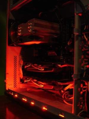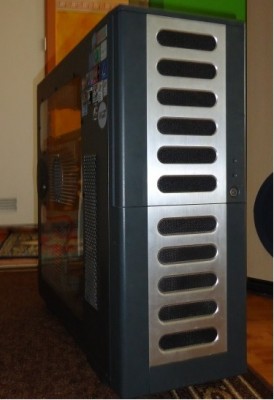 A vásárlás óta, egy pár konfiguráció már megfordult benne, Intel-AMD egyaránt. Történtek módosítások is, mégpedig a tetejét kivágtam egy 12cm-es ventilátor helyet, aztán az előlap mögött is kivágtam, hogy oda beférjen szintén egy 12cm-es venti. Az oldallap is kapott egy kisebb díszítést. :) A legutolsó állapotában így nézett ki a ház: