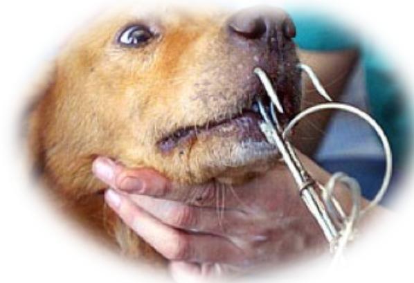 Amíg én azon töprengtem, hogy :''mit tegyünk? ki tudna most éjnek idején segíteni nekünk? melyik állat-klinikára menjünk? kit tudnánk föhívni? '' , addig a nagyobbik fiam azonnal cselekedett, előhozott a garázsból egy erős, éles fogót, amivel ügyesen lecsípte a nyílas kampókat a vérző pofázmányból. Csokyt símogatással vígasztalgatva próbáltuk mozdulatlanul tartani a beavatkozás alatt, hogy az otromba szerszám nehogy a bőrébe vágjon, s az elsősegélynyújtás nehogy még nagyobb balesetbe torkolljon.