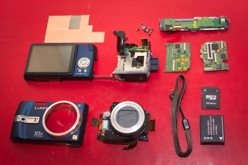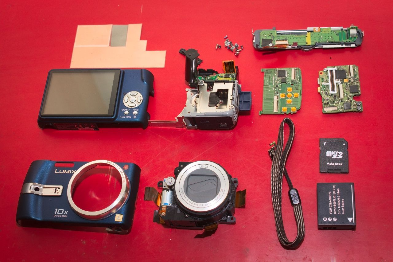 Lebontottam a gépet, mivel a tápellátás ellenőrzéséhez elég hozzáférhetetlen helyekre kellett bejutni. A szétszedés elsőre nem bonyolult, a burkolat könnyen lejön, egyedül a kijelző kábelei sérülékenyek. A belső egységek már könnyen szétválaszthatók, az objektív is csak pár csavarral rögzül, egyedül a vaku és a vele egybeépített akkuérintkezők azok, amiket nem sikerült szétbontani.