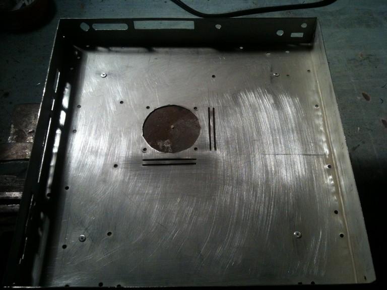 Fogtam egy régi ház oldallapját és kivágtam belőle először egy négyzetet, majd azt is továbbvágtam a sarkainál, hogy „láda” formájúvá origamizzam. Nem szórakoztam sokat a hajlítással, nem is lett szép (a kalapács teszi a dolgát..), de legalább pontos lett és a végén kap alu profilt minden élére a csúnyaságok eltakarása miatt, tehát nincs gond.