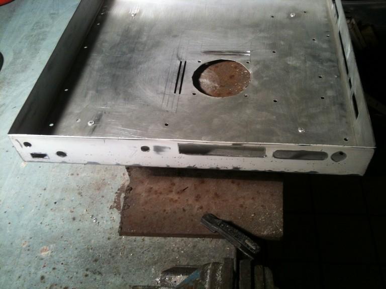 A különböző csatlakozóknak USB, SD kártya olvasó, jack dugalj meg hátul/alul a szellőzésnek, táp csatlakozónak készítettem nyílásokat fúróval, sarokcsiszolóval meg sok-sok reszeléssel és így néz ki csiszolatlanul minden hibájával együtt: