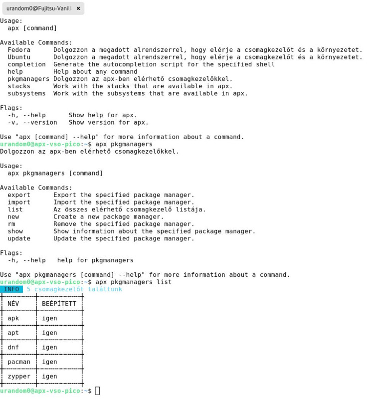 Tehát az apx automatikusan lefordítja az adott disztróhoz tartozó csomagkezelő parancsára az általunk kiadott parancsot (install, remove, stb.), így még az adott konténerben lévő disztró csomagkezelőjét sem feltétlenül kell ismernünk.