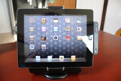 Az iPad behelyezése egész könnyen megy, persze a csatlakozónál érdemes vigyázni. Ez egyébként pont jó helyen van, nem feszül a csatlakozó. Kivenni már jóval nehezebb, de azért megoldható. (remélhetőleg a későbbi modellekbe tesznek egy kis billenő mechanikát, ami segít a kidokkolásban).