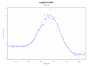 Első körben vezetékes módban mértem le, és nyilván sok mérés átlagából kb. 1 ms input lagot mértem. Ötletem sincs, mi okozhatja, de nem lep meg túlzottan: Razer Mamba 2012 is 3 ms input lagtól szenvedett. Az eltolás előtti és utáni grafikonokat is megmutatom, hogy lássátok, tényleg ott van az a késés.