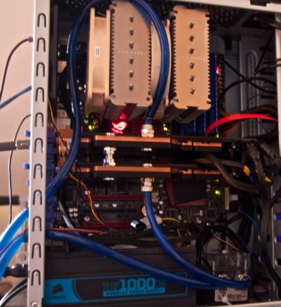 Azonban ahogy telt az idő, a Milkyway projekt fórumában rábukkantam, hogy az ATI videókártyák azonos teljesítmény felvétel mellett sokkal nagyobb számítási teljesítményt képesek leadni. Így első lépésben egy ATI Radeon HD5970-es kártya került a gépbe a számítási teljesítmény növelése céljából, majd az Nvidia kártya helyére is egy HD5970-es került. Így elérte a gép a maximális teljesítményt amit ki lehetett hozni a konfigurációból. A konfigurációnak két zavaró tényezője volt. Az egyik, hogy nyáron a szobában 60 fok uralkodott, a másik, hogy olyan hangos volt a hűtés, hogy két szobával arrébb is tisztán lehetett hallani. A két VGA kártya kapott így egy vízhűtést, amellyel a 105 fokos üzemi hőmérséklet lecsökkent 55 fokosra, és a hangja szinte megszűnt. Jelenleg a CPU hűtő a leghangosabb komponens. A vízhűtés mellékhatásaként a kártyák sebessége megnőtt, így átléptem a napi 800.000 egységes határt.