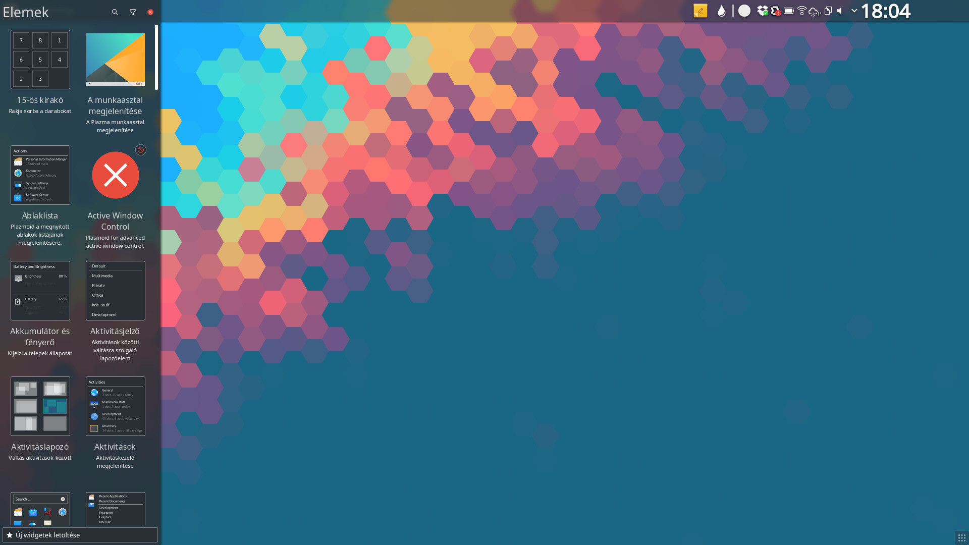 Widgetek hozzáadásához a panelen, vagy a dockon (vagy az asztalon) jobb gombot nyomva válasszuk a widgetek hozzáadása lehetőséget, ekkor böngészhetjük a telepített widgeteket, vagy letölthetünk újabbakat. Ugyanazokat a widgeteket használhatjuk a panelen, vagy az asztalon is, egy részük átskálázódik, míg mások csak egy méretben érhetőek el. A panelen minden elem egy widget, beleértve a Manjaro logo formájában megjelenő programindító ikonját, a globális menüt, jegyzettömböt, órát stb. Sőt, esetemben még az ablakvezérlők is, mivel így tudtam a felső dockra integrálni azokat.
