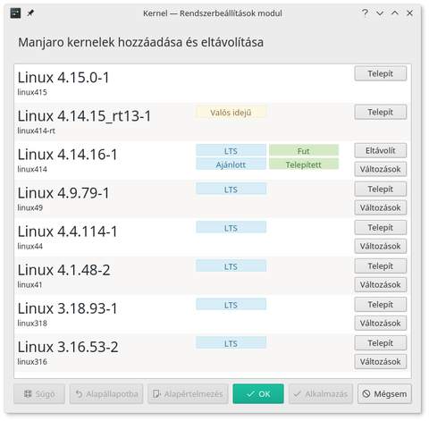 Másik hasznos eszköze a Manjaro beállításoknak a kernelek, ami a különböző kernelek telepítését teszi lehetővé egyszerűen. A kernelek biztosítják többek között az új hardverelemek megfelelő működését, valamint hibajavításokat, vagy új szolgáltatásokat is tartalmazhatnak, így érdemes naprakészen tartani a rendszer magját is. Egyszerűen, grafikus felületről telepíthetünk újabb kerneleket, és távolíthatunk el régieket. A rendszer egyaránt figyelmeztet az új kernelekre, valamint a már elavult, nem támogatott kernelek eltávolítására is. A Manjaro alapértelmezetten LTS, vagyis hosszan támogatott kernelekkel kerül telepítésre, de lehetőségünk van mindig a legújabb, akár valós idejű kernelek telepítésére is.
