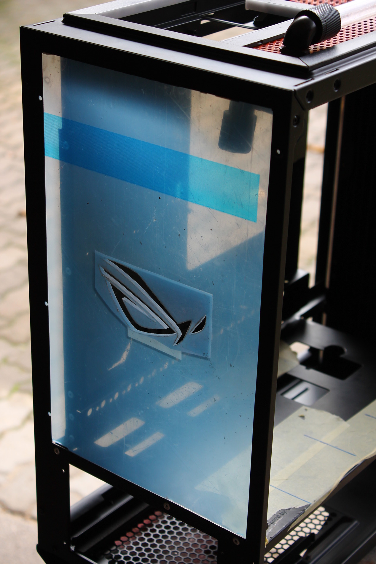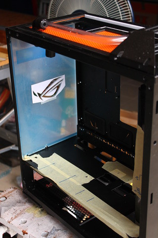 Az előző oldalon említettem, hogy a gyárilag kialakított I/O panel elköltöztetését követően szükségszerűvé vált a helyére egy megfelelő elem elkészítése. Ezúttal (is) a plexit vettem elő, amit nem csak egyszerűen méretre szabva kívántam elhelyezni, hanem a fordított elrendezésnek köszönhetően ebbe a formavilágba illeszteni. Elsőnek a ROG logót vágtam ki, amihez remek segítség a Dremel asztali fűrészgépe. A kinyomtatott rajzot felragasztottam a plexire, majd szépen kivágtam.