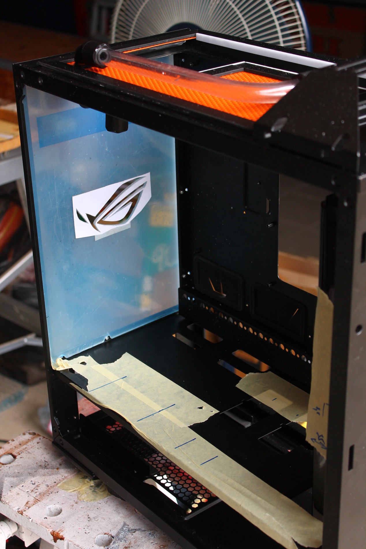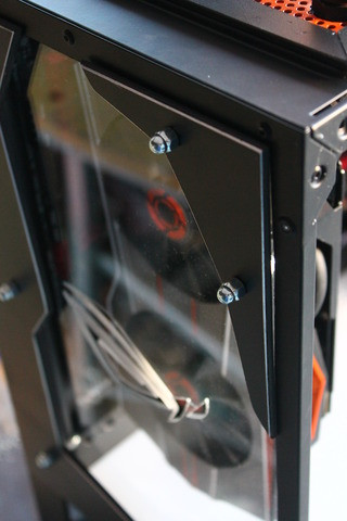 Az alaplap elfordításából következően a VGA kártyák is függőleges elrendezésbe kerültek, ami egyrészt kizárja a kártyák súlyából adódó lehajlást, másrészt lehetőséget biztosít olyan elvetemült emberek számára, mint én is vagyok, hogy kiéljék romboló és egyben építő hajlamaikat. Ez nálam a következő formában öltött testet.