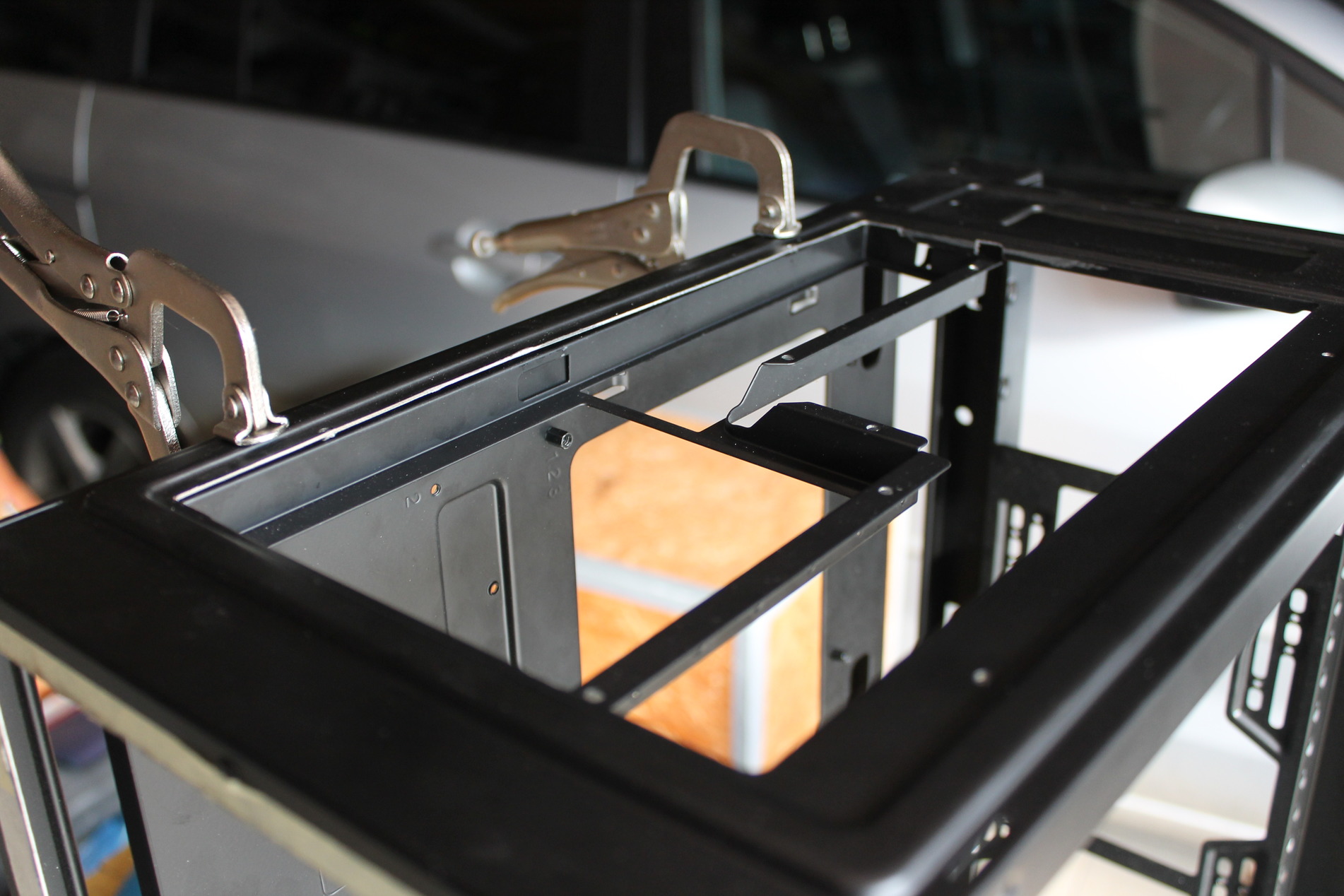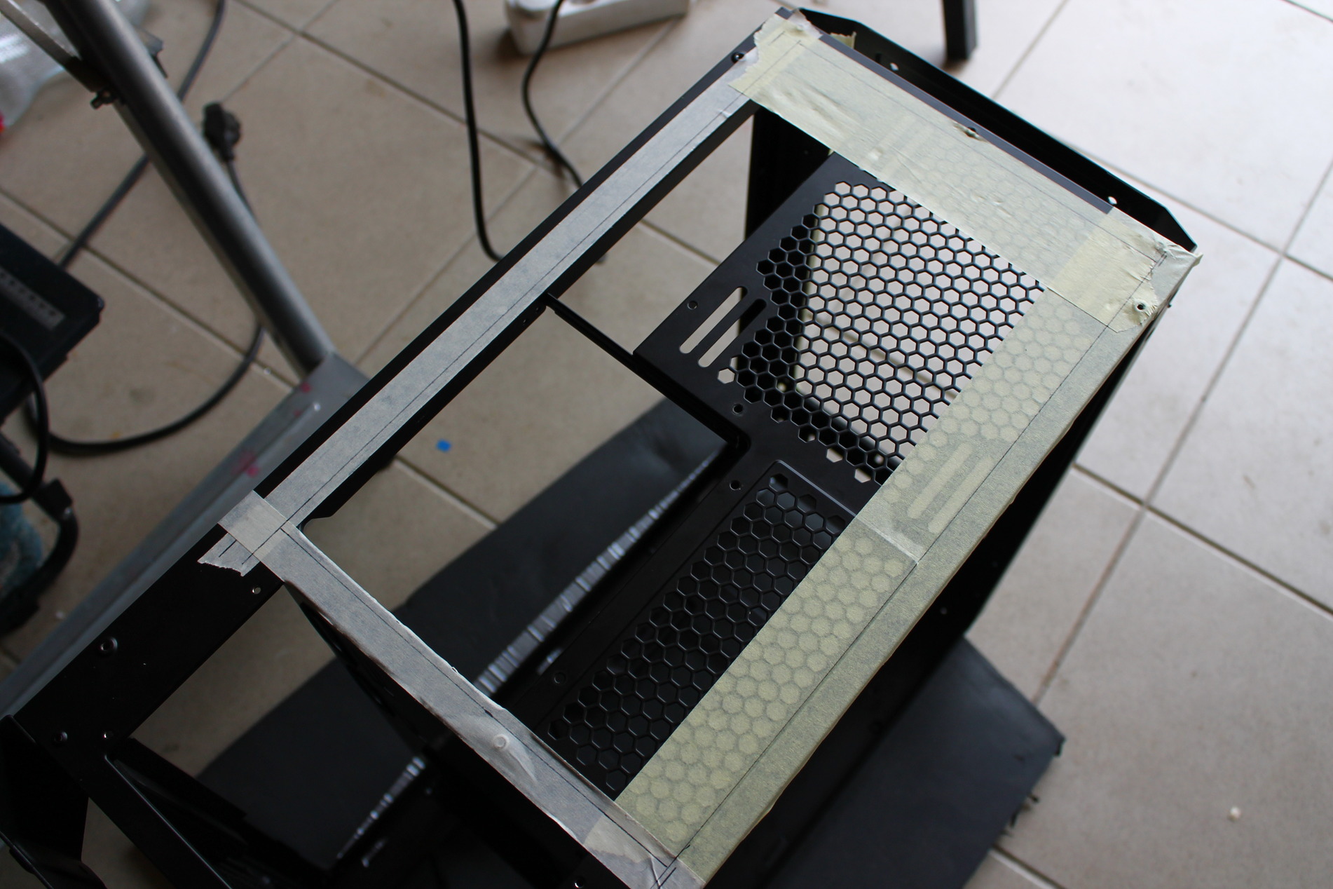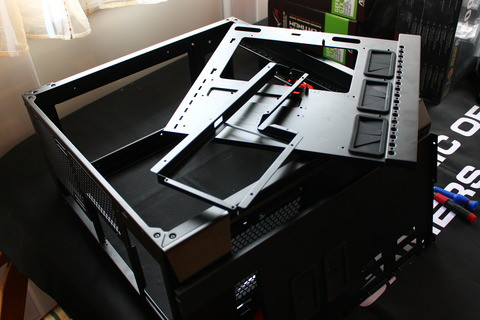 Az elképzelésem a ház kialakításával kapcsolatosan kissé eltérő a megszokott dolgoktól, bár nagyon nem akartam elrugaszkodni extrém dolgokkal, lévén ennek a gépnek november 26-ra el kell készülnie a budapesti PlayIT rendezvényre. A ház megérkezésekor a szokásos fotók elkészítését követően neki is estem a háznak, a számomra fölösleges dolgok eltávolítását követően (gyakorlatilag semmi nem maradt benne) az alaplapi tálcát is kiszereltem és 90°-ban elfordítottam. Ehhez ugye megfelelő rögzítési pontokat kellett kialakítani, valamint a kellő stabilitást is meg kellett oldani.