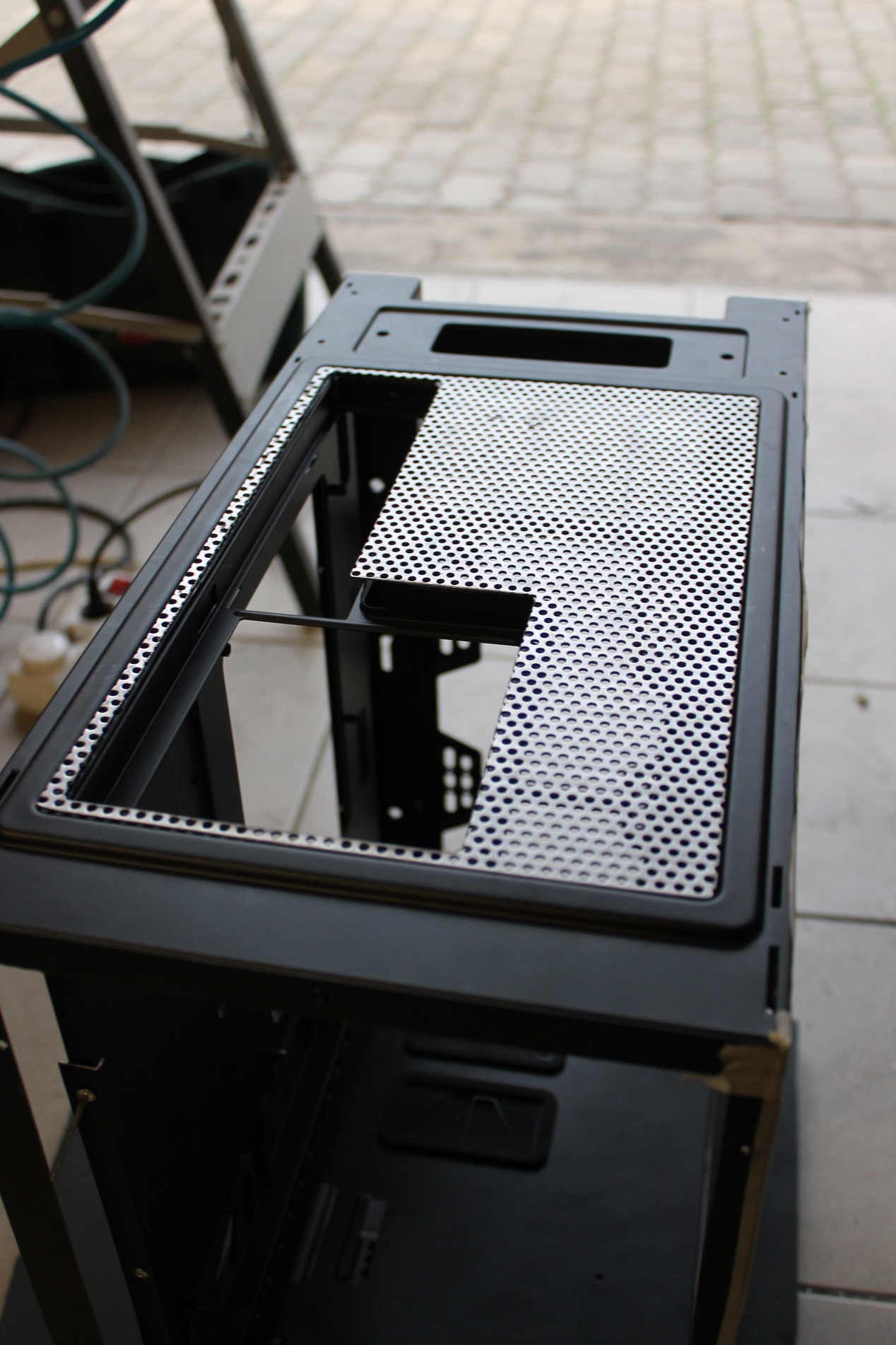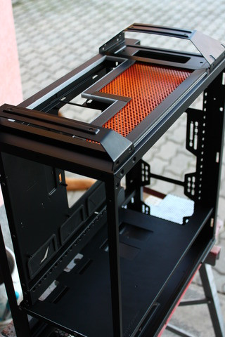 Igen ám, de ha már elfordítottam az alaplapi tálcát, kell neki megfelelő I/O panel, amihez részben a gyárilag kialakított részt használtam fel. Na de ha kivágom hátulról és felszerelem felülre, mi lesz a hátsó résszel? Természetesen erre is megvan az elképzelésem, aminek kapcsán nem teljesen hétköznapi gépet fogok kapni. A munkafolyamatról képek: