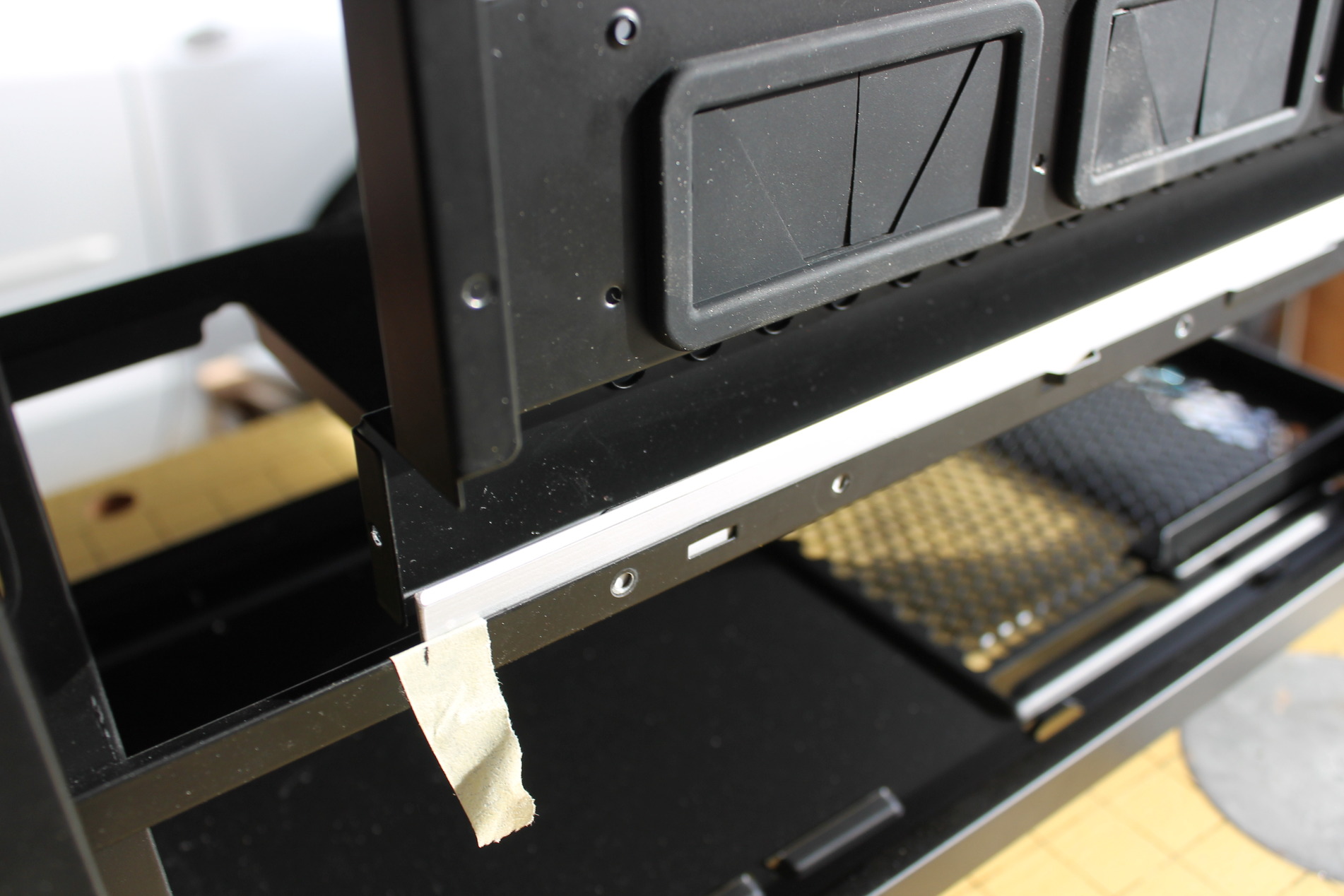Ennek az óriási előnye, hogy a perforált lemez mögött még porszűrő is van beépítve, amit egy egyszerű mozdulattal kilehet emelni. Akarom mondani ki lehetett emelni, most már nem. Az 5,25" bővítő helyekre sem volt szükségem, így ez a forma nem igazán illett az elképzelésembe. A kivehető elemeket tartó műanyag pöcköket kireszeltem, ezek helyére a csiszolási nyomok eltüntetésére habosított PVC lemezt vágtam és ragasztottam fel. A ventilátorok eltakarására egy szendvics kialakítású alumínium lemezt és plexi használtam fel. Ezekből 25mm-es csíkokat vágtam, a lemezt feketére fényeztem, majd közéjük ragasztottam a plexit. Kötést követően az éleket síkba csiszoltam majd políroztam. Így ugyan azt a hatást értem el, mint a hátsó panel dekor elemeinél. Az élek fényesen csillognak. Az összeillesztéshez 5 mm-es alumínium csőből távtartókat vágtam, majd ezeket egy 3 mm-es menetes szárra felfűztem. A kerethez rögzítéshez a megfelelő helyekre mindkettő oldalra lyukakat fúrtam, és a beillesztett rácsot rejtett csavarozással rögzítettem a keretbe.