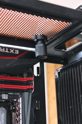A gép belsejébe visszatérő csatlakozóval a videókártya terjedelme miatt szükséges volt egy elhúzást készíteni. Ehhez a szponzortól kapott 90°-os 87°-os csatlakozókat használtam. Mikor megláttam, azt hittem, agylobot kapok, ráadásul, mikor ezt jeleztem a supportnak, írták, hogy tudnak róla. 90°-os csatlakozó, ami nem derékszög, szuper!
