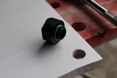 A kábelezést követően a kialakított csatlakozó helyekre beraktam a Nanoxia fittingjeit, aminek külön procedúrája van. Ugyanis először le kell venni a gyárilag rárakott dupla O gumigyűrűt, hogy a világító LED gyűrűt rá le lehessen tenni. Ez alá adnak egy szigetelő gyűrűt, ami megakadályozza a rövidzár lehetőségét, lévén a forrasztások a gyűrű alján vannak. Ezt követően kell visszarakni a tömítő gyűrűket, és lehet a csövet ráhúzni. A világító LED-ekhez szépen kivitelezett 30 cm hosszúságú harisnyázott kábel tartozik. Ezeket, hogy ne legyen kábeldömping a gép különböző részein, lévén 10 darab ilyen típusú lett beépítve, megfelelően el kellett vezetni, Ehhez már a csatlakozó helyek kialakításánál ügyeltem, hogy a kábelkivezetés a hátsó részre kerüljön, illetve magának a kábeleknek is készítettem megfelelő lukat, így a takaró lemezek alatt vezettem el őket.